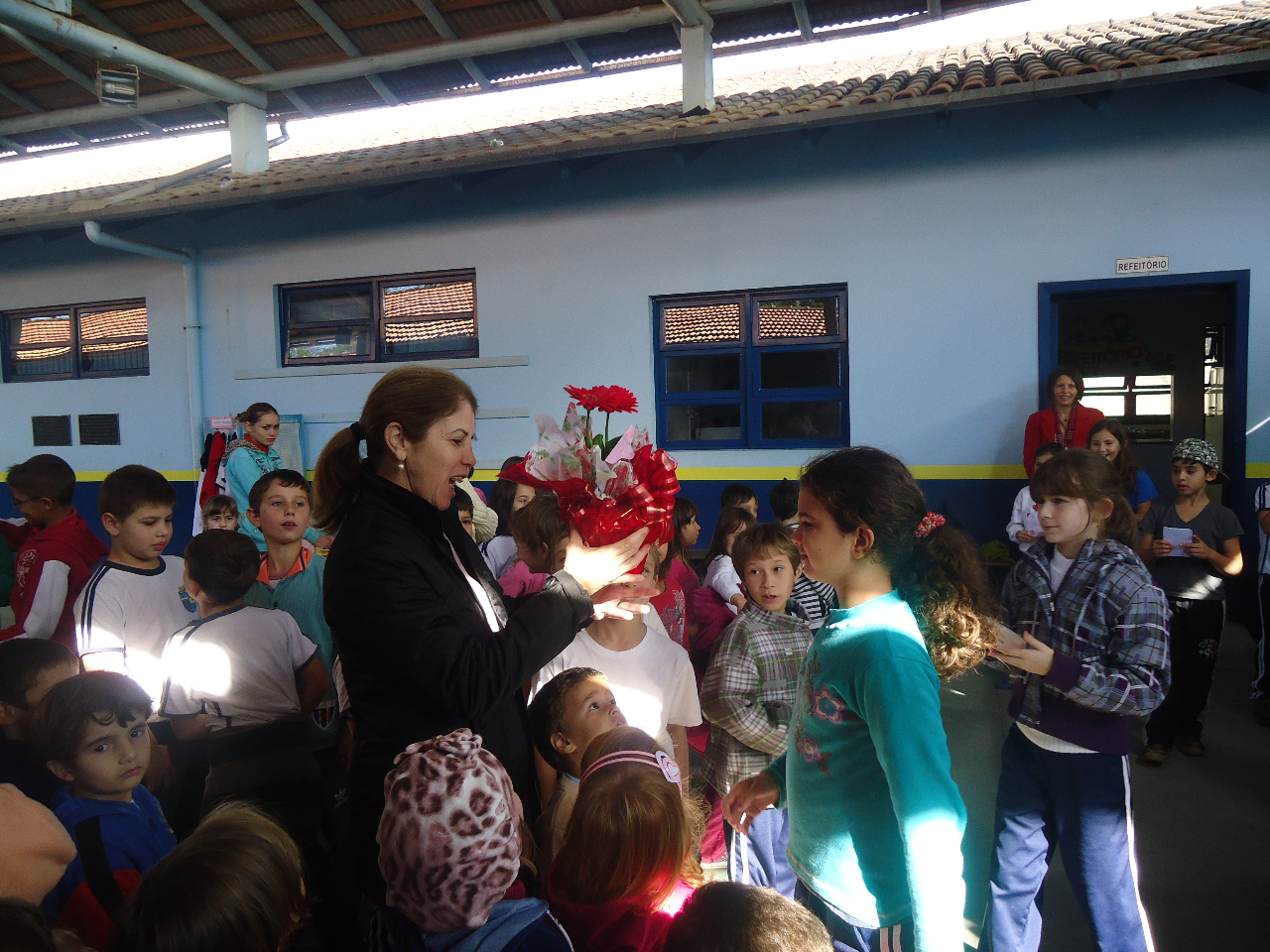 Nossa Pedagoga - Sra. Edlamar - foi homenageada no dia 21 de maio - terça-feira - quando a escola se reúne para cantar o Hino Nacional e prestar homenagens a datas comemorativas; também aproveitamos para dar avisos paroquiais e cantar parabéns aos aniversariantes do mês; a Pedagoga foi homenageada com flores, presentes e mensagens espontâneas de nossos alunos.